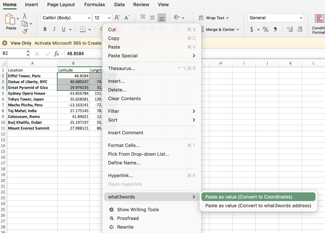 - Right click → “what3words” → “Paste as value (Convert to coordinates)”.